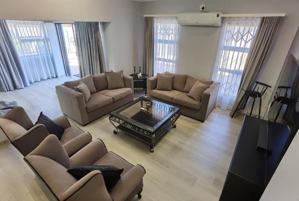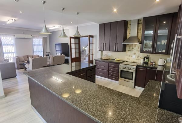 Step into a beautifully maintained, open-plan living area that flows seamlessly between the lounge, dining room, and modern kitchen. Large windows and expansive doors invite in natural light, creating a bright, airy atmosphere throughout. The entire home features laminated flooring and air-conditioning in every room and living area, ensuring year-round comfort.
