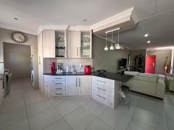 The home features an inviting open-plan lounge and dining area, seamlessly flowing into a well-equipped kitchen fitted with built-in cupboards, an eye-level oven and hob, a convenient breakfast nook, and a separate scullery for added practicality.