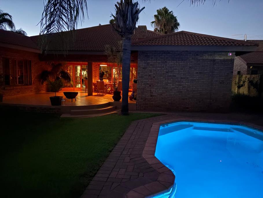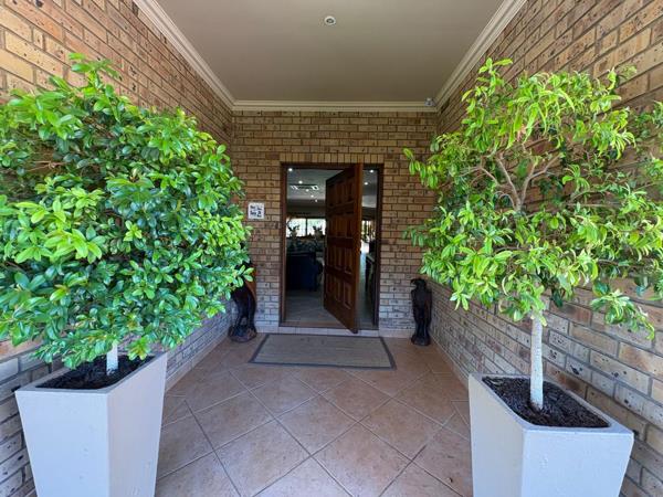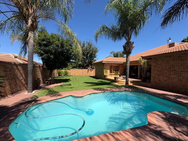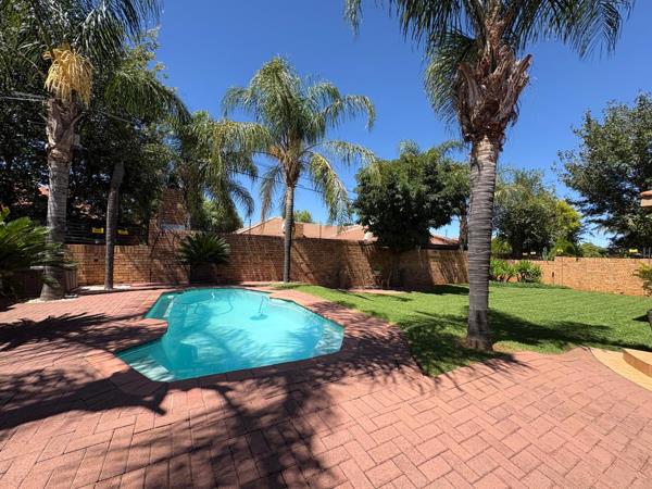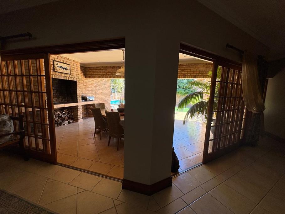 A covered patio with a built-in braai overlooks a lush, manicured garden and sparkling pool creating the perfect setting for weekend braais, summer gatherings, or relaxed evenings with family and friends. The seamless indoor-outdoor flow enhances the sense of space and makes entertaining effortless