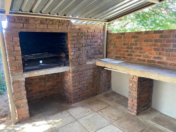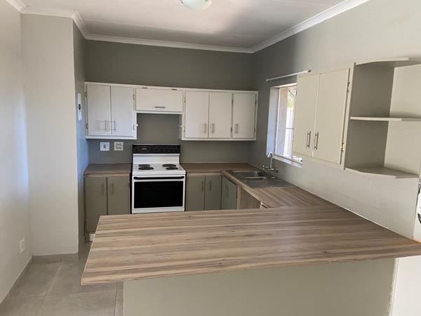 1 Bathrooms, including an en-suite to the main bedroom. Open-plan kitchen and living area, with glass sliding doors leading to a welcoming patio. Well-equipped kitchen with ample cupboard space and a stove. Air conditioners in the living area and main bedroom, ceiling fans in the remaining rooms. Single garage plus double carport fits 2 vehicles. Front and back garden with neat paving running from front to back alongside the garage. Built-in braai under a covered patio perfect for entertaining. Burglar bars on all windows for added security.
