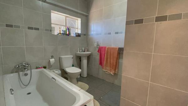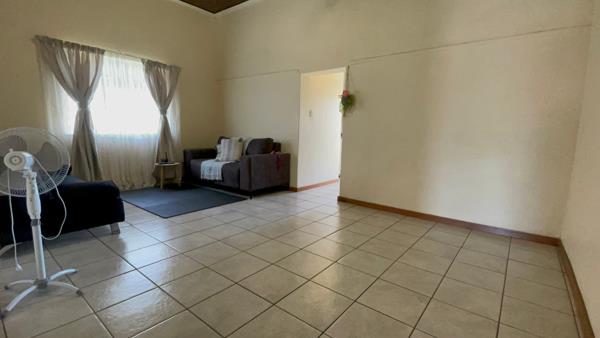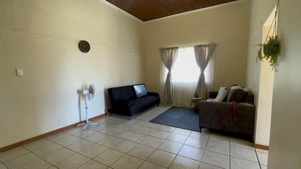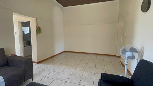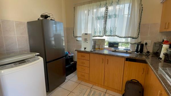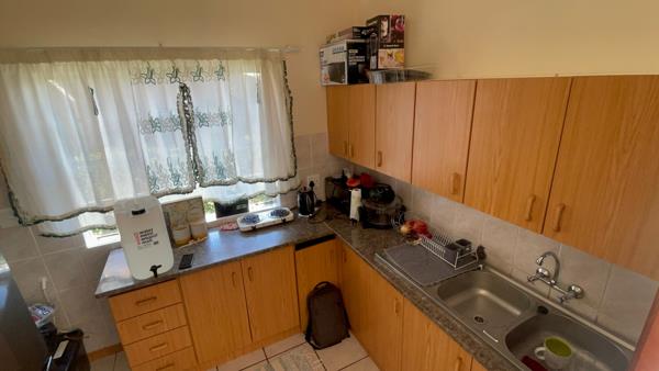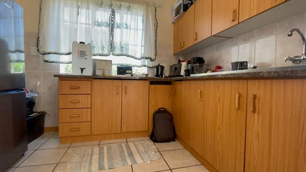 Down the passage, discover the open-plan lounge and dining area with high ceilings, creating a spacious and inviting atmosphere. The lovely kitchen comes fitted with built-in cupboards.