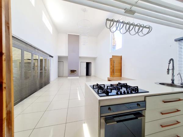 The open-plan kitchen alongside a well-appointed scullery, pantry, and a dedicated laundry room seamlessly connects to the dining area and lounge, which features a cozy fireplace and flows effortlessly onto a spacious balcony.