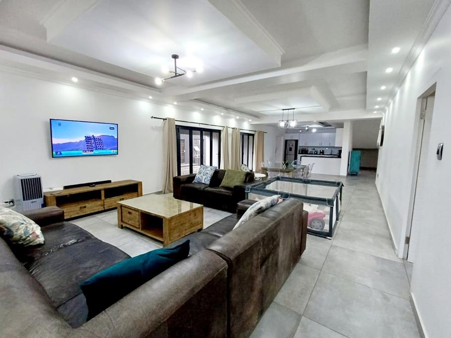 The upper level of this stunning home boasts three stylish bedrooms, each opening onto its own private balcony, offering breathtaking views and ample natural light. The built-in cupboards provide plenty of storage, while each en-suite bathroom is designed with modern fittings for ultimate comfort. A spacious pajama lounge serves as a cozy retreat for the family, creating the perfect space to relax and unwind.