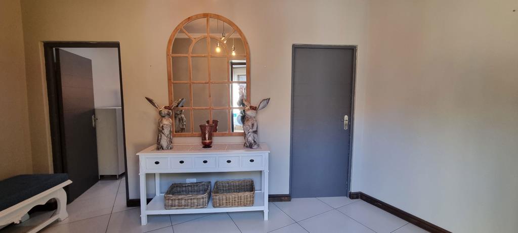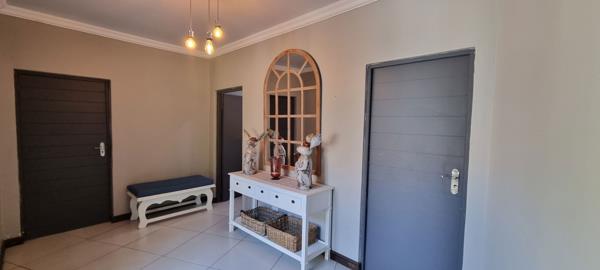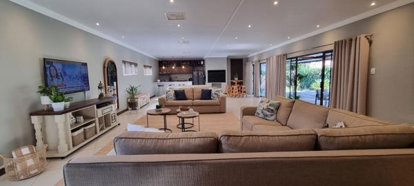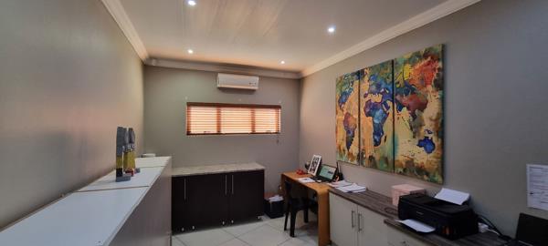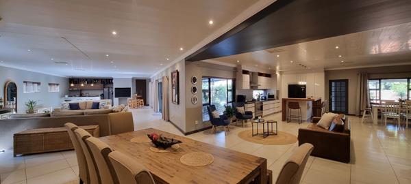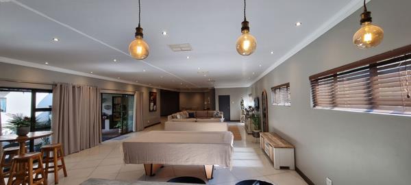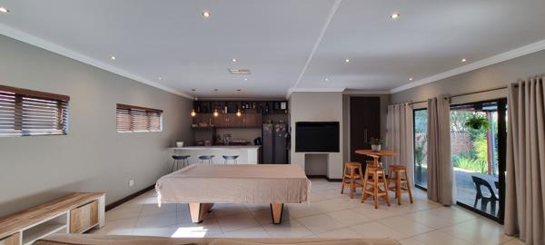 Designed for both living and entertaining, the home boasts a welcoming reception area, a private office, and a fully equipped gym room with its own en-suite bathroom. The open-plan layout seamlessly connects the kitchen, dining room, lounge, and entertainment area, highlighted by a built-in bar counter and an indoor braai. A separate scullery adds convenience and keeps the main kitchen pristine.