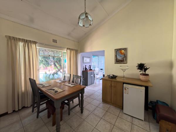 The main residence features three spacious double bedrooms with built-in cupboards and two neat bathrooms. The living areas are designed for connection, boasting a seamless flow between the open-plan kitchen, lounge, dining room, and TV room.