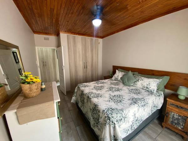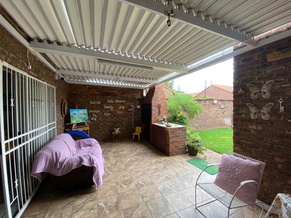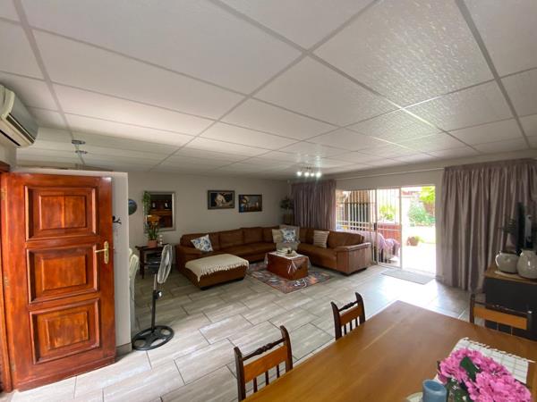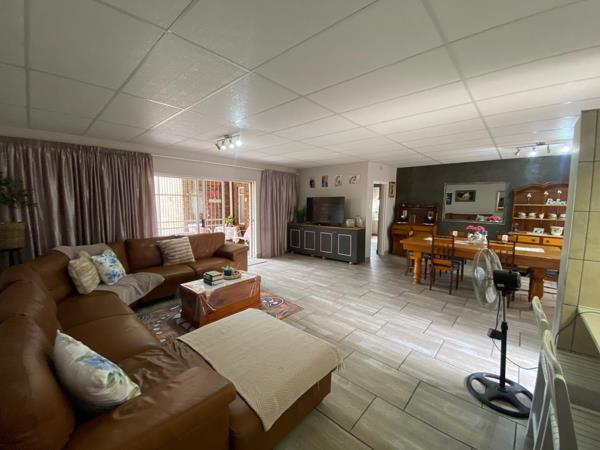 The open-plan living and dining areas flow effortlessly to a covered outdoor entertainment area, complete with a built-in braai.