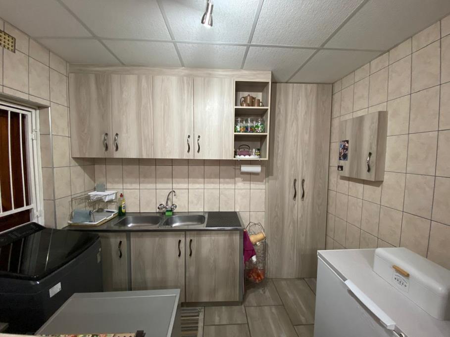 At the heart of the home lies a modern kitchen, fitted with granite countertops, an eye-level oven, and a separate scullery with built-in cupboards.
