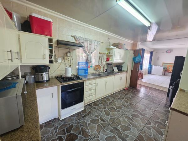 The main house features three bedrooms and two bathrooms, one of which is en-suite. The home offers a spacious lounge, dining room, and kitchen fitted with built-in cupboards, an under-counter oven, hob, and extractor fan.