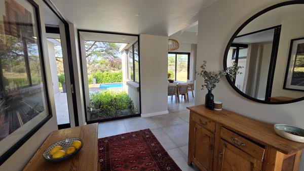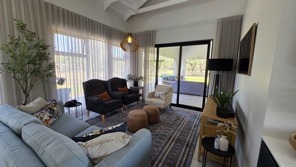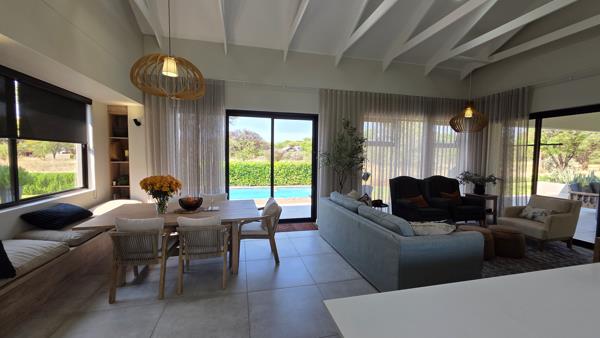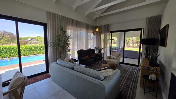 Stepping inside, the open-plan living area immediately draws you in. To the right of the entrance is a lounge, dining area, and modern kitchen, all designed with seamless flow in mind. Large Palace doors open onto the sparkling 8m swimming pool and the covered patio, where a built-in braai, Caesarstone worktop, and prep basin make entertaining effortless. Enjoy views of the Kalahari veld, offering the perfect setting for family gatherings or sundowners with friends.