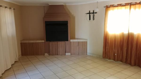 The house has a spacious living room and indoor braai area with sliding doors. There is a kitchen with built in cupboards.