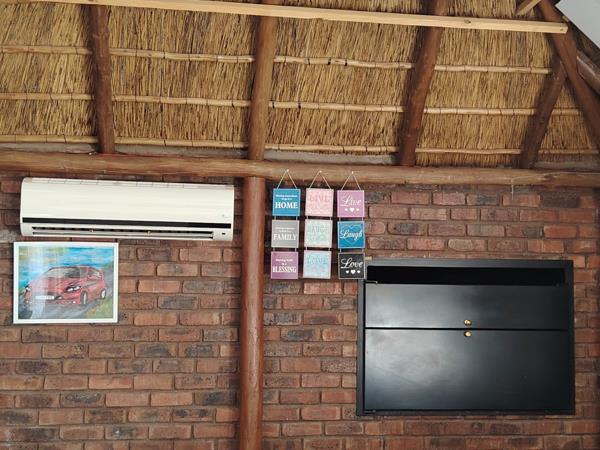 This charming 3-bedroom, 2-bathroom family home, including one ensuite, is nestled on a generous 991 sqm erf in the heart of Postmasburg, South Africa. Designed for comfortable living, the residence features a welcoming lounge and a dedicated dining room, perfect for family gatherings. The dining area boasts a warm wooden paneled ceiling, adding character, while an air conditioning unit ensures comfort. The well-appointed kitchen includes a convenient pantry, catering to all culinary needs. A unique indoor space, possibly an entertainment area, showcases a rustic thatched roof and exposed wooden beams, complemented by brick walls and a fireplace, creating an inviting atmosphere.