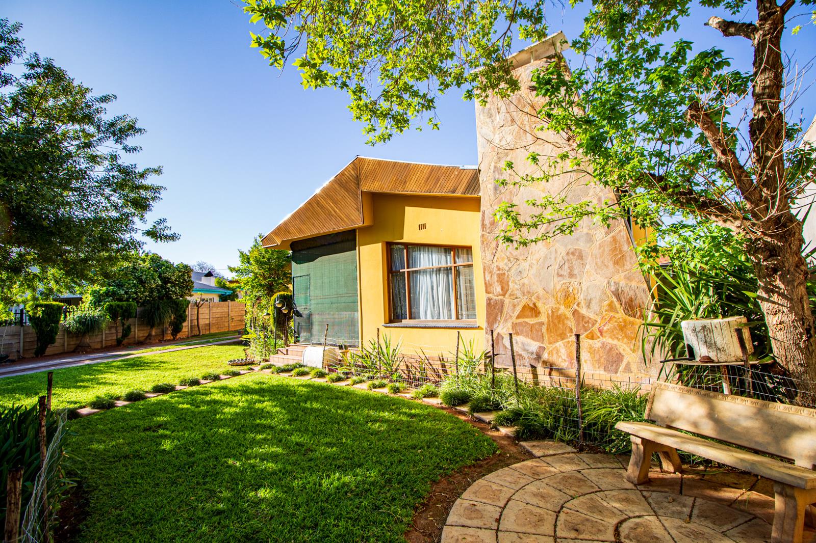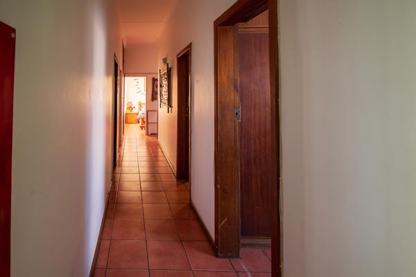 Tucked away in the beloved neighborhood of Die Rand, this versatile 4-bedroom home is an absolute hidden gem. Overlooking a beautifully kept municipal park with lush green lawns and sturdy old trees, this home combines peaceful surroundings with practical family living.