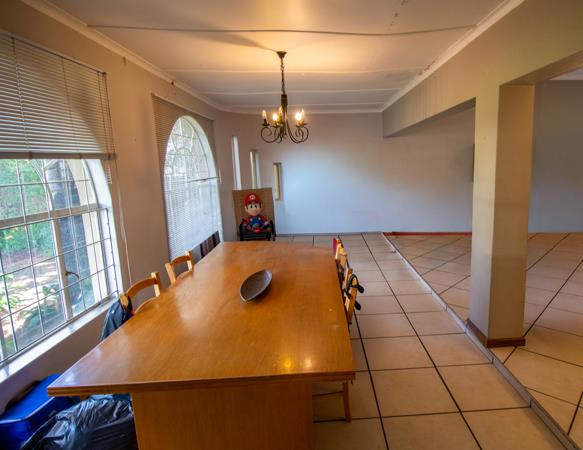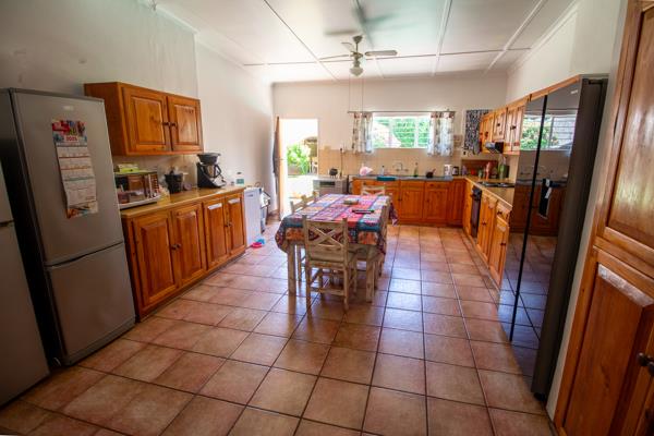 A true highlight of this home is the open-plan entertainment area, offering three versatile entertaining spaces, all beautifully tiled for easy maintenance. This area flows seamlessly to the thatch-covered veranda, which overlooks a neat, well-kept garden with an electronic irrigation system.