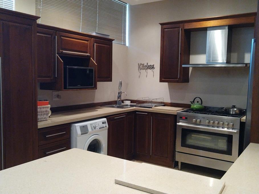 Living Area & Kitchen: Spacious open-plan living area and kitchen. The kitchen is beautifully equipped with built-in cupboards, granite countertops, breakfast counter, and a water purification system. The living area includes a split unit air conditioner and a sliding glass door opening onto the patio.