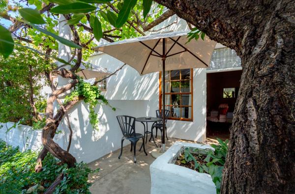 Private patios under shady trees with outdoor seating.