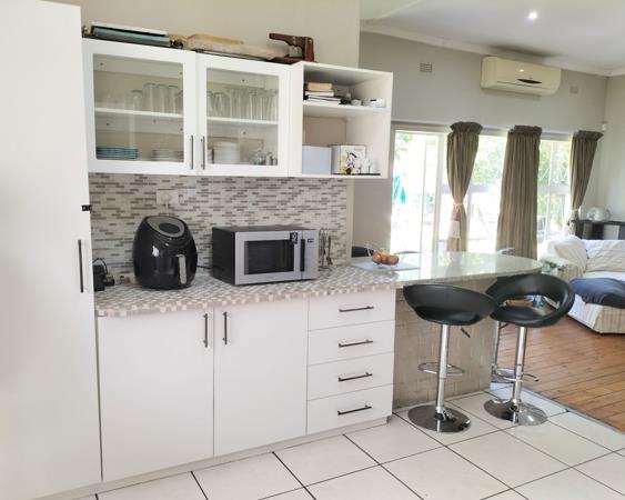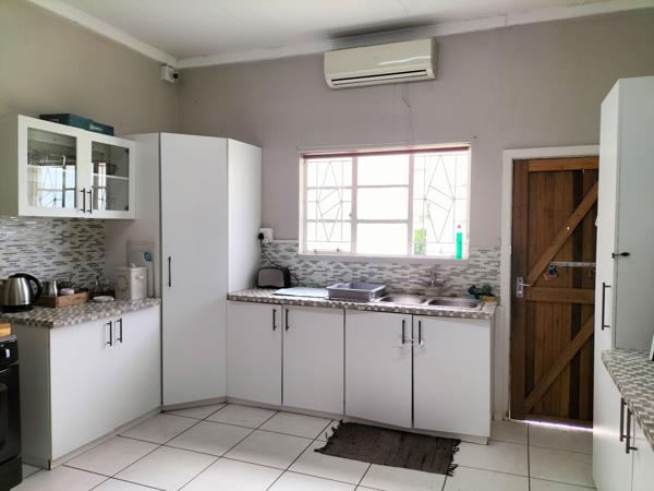 The open-plan kitchen, which is modern and functional with built-in cupboards, flows into the dining room and lounge, seamlessly leading to a cozy living area with an indoor braai perfect for entertaining guests.