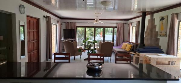The spacious open-plan kitchen with marble tops, flows effortlessly into the living area and through stacking doors onto a private patio with an outside built-in braai. The living room also features a beautiful built-in fireplace, adding warmth and character to the home. This is the spot for families and friends to get together and enjoy everything that a river lifestyle has to offer.