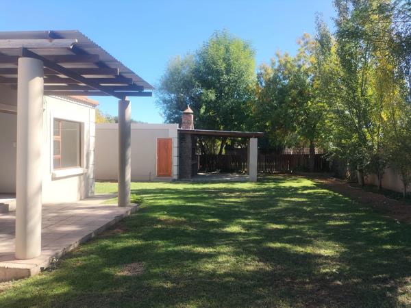 The open-plan kitchen provides ample cupboard space and flows seamlessly into the dining area and lounge, creating a welcoming environment for family and guests. From the lounge, sliding doors lead out to a well-kept garden and a patio with a built-in braaiperfect for entertaining.
