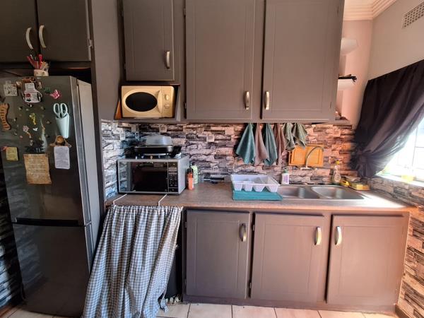 Kitchen fitted with built-in cupboards, an under-counter oven and hob
