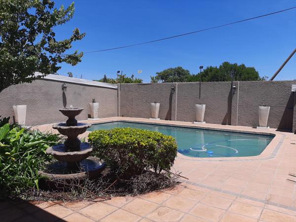 The well-appointed kitchen includes a walk-in pantry, separate scullery, and even an iron room with ample built-in cupboards. Entertain in style with the undercover braai area overlooking a sparkling swimming pool, perfect for year-round enjoyment.