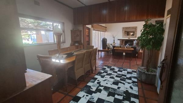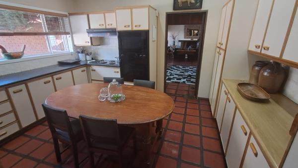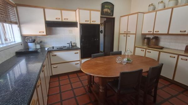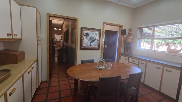 The dining room is open-plan and flows into a well-equipped kitchen with a eye-level oven, hob, breakfast nook, and dishwasher connection