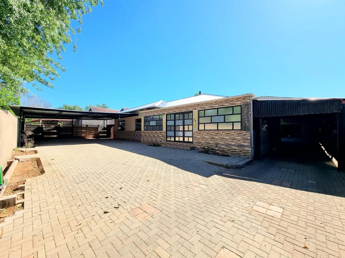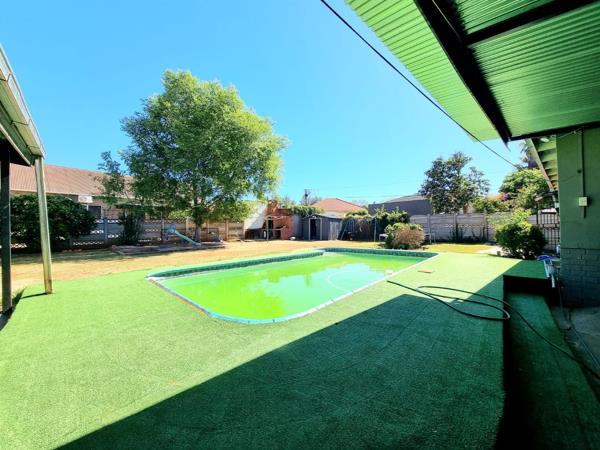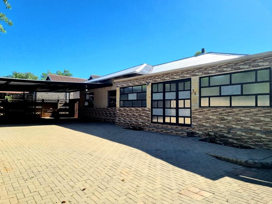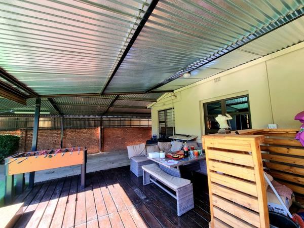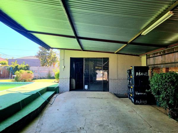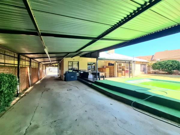 The property includes practical amenities such as a roll-up garage for secure vehicle storage, complemented by a large carport that can accommodate multiple vehicles. One of the standout features is the beautiful stoep (covered patio) that overlooks the swimming pool, creating the perfect setting for entertaining friends and family while enjoying the outdoor lifestyle.