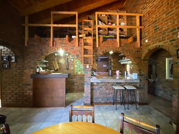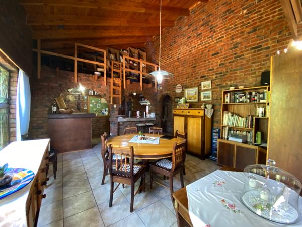 Dining Room Boasts double lofted ceilings and a hidden mezzanine floor, perfect for storage or a private library, accessed via a ladder.