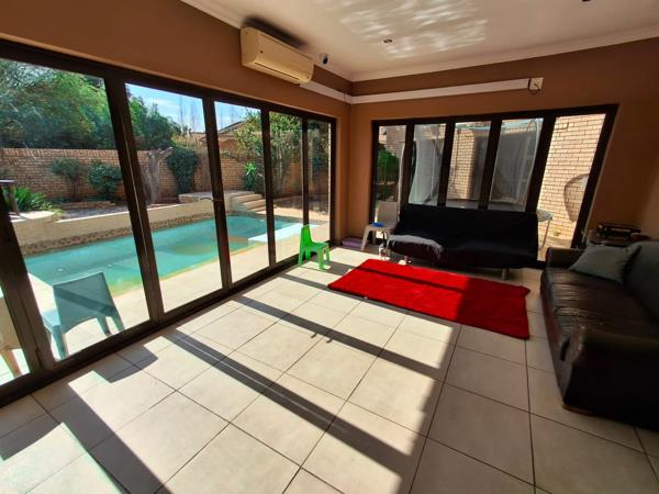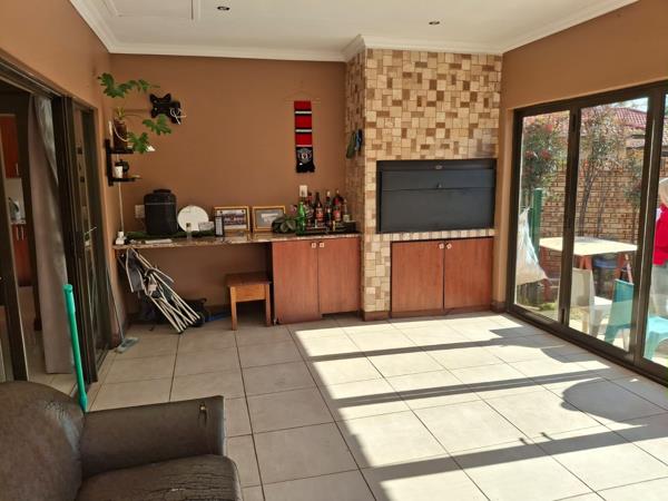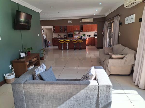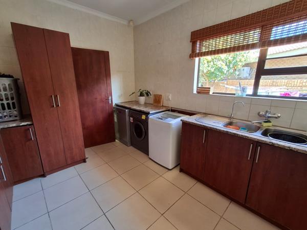 The heart of the home is the expansive open-plan living area. It includes a TV lounge, dining space, and a modern kitchen with a gas stove, large pantry, and separate scullery. The indoor braai room opens via sliding doors to the pool and garden area, creating a seamless flow for year-round enjoyment.
