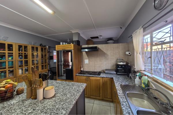 The kitchen is a dream with granite countertops and a separate scullery, making meal prep a pleasure. This expansive home sits on a generous 1230m2 erf and offers even more convenience with three garages, two street entrances, a storeroom, and domestic quarters. Plus, the third garage has the potential to be a private flatlet with its own entrance.
