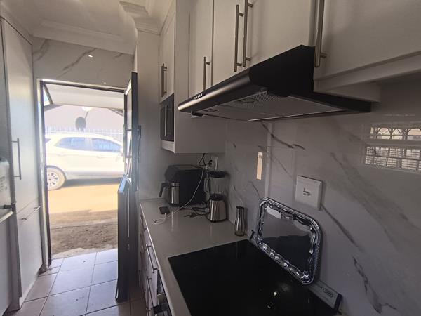 Open plan kitchen with built-in cupboards and beautifully tiled.