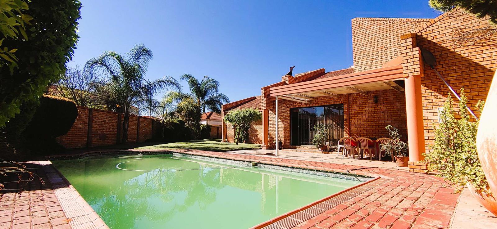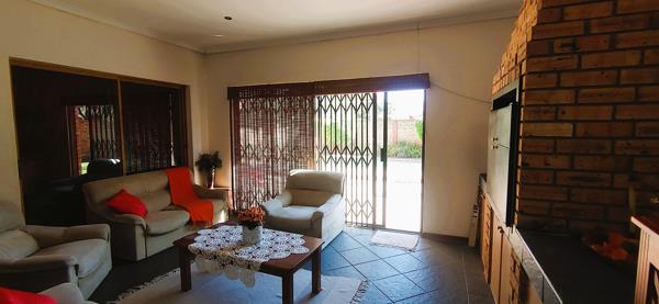 featuring solid wooden cupboards, a gas hob, and a separate scullery/laundry. The home boasts an indoor braai room with glass sliding doors opening to a lush garden and sparkling poolperfect for year-round entertaining.