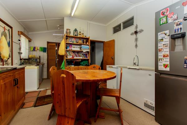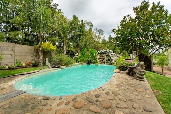Outdoors, the lush garden boasts a rock swimming pool, expansive lawns, and three waterblommetjie dams. Theres a spacious workshop, garage with additional canopy for a caravan, and livestock enclosures for pigs, chickens, and other animals. A four-room cottage, ready for renovation, offers potential as guest or staff accommodation.