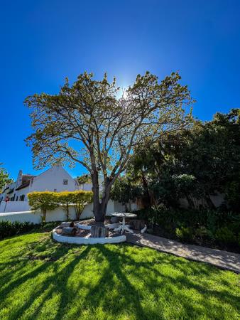 The property boasts landscaped, water-wise gardens designed for low maintenance. Lavender hedges, mature trees, and private seating areas enhance the tranquil setting. The enclosed back garden includes a stoep ideal for entertaining or quiet relaxation, while the front garden provides the perfect space for outdoor living and leisure.