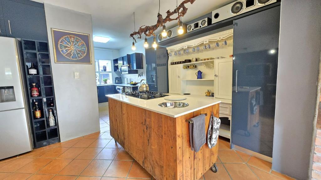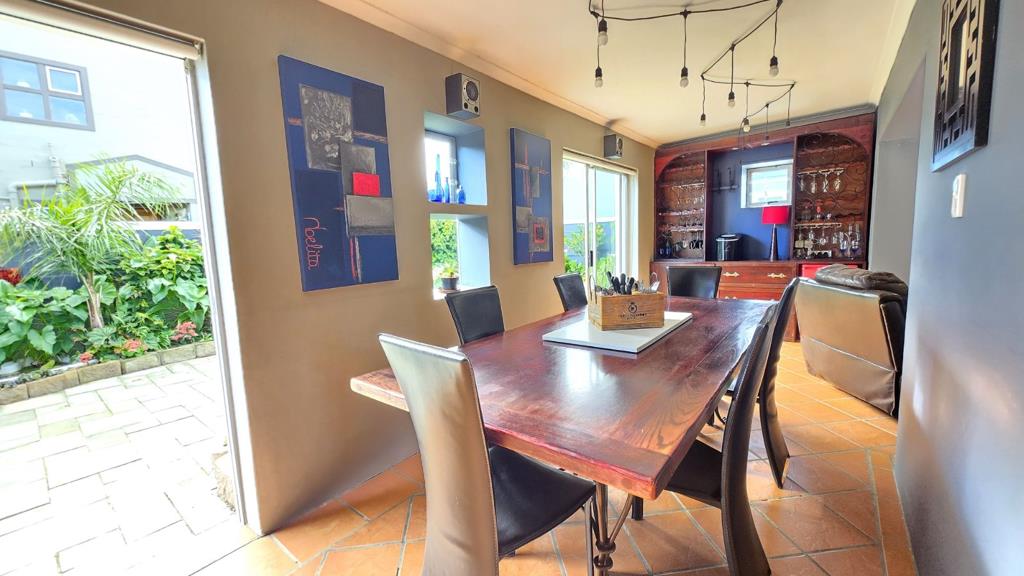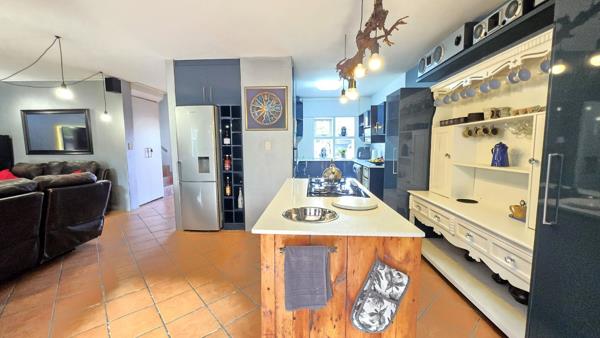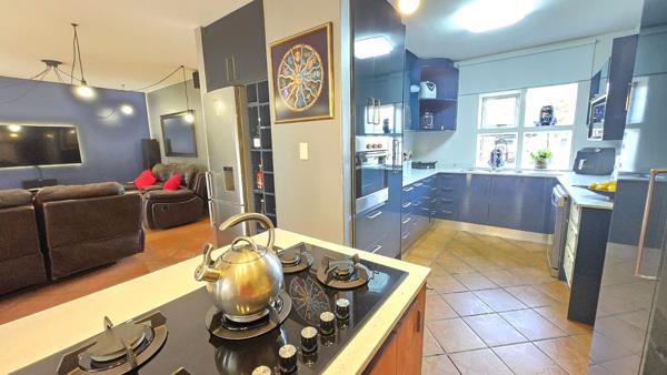 The ground floor features the heart of the home, bright and airy open plan living space that includes a newly installed, modern kitchen with a movable island, ideal for both entertaining and daily living. The kitchen flows seamlessly into the dining, lounge and braai area, which opens through large sliding doors onto the garden and covered lapa.