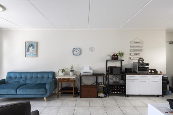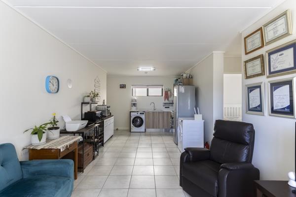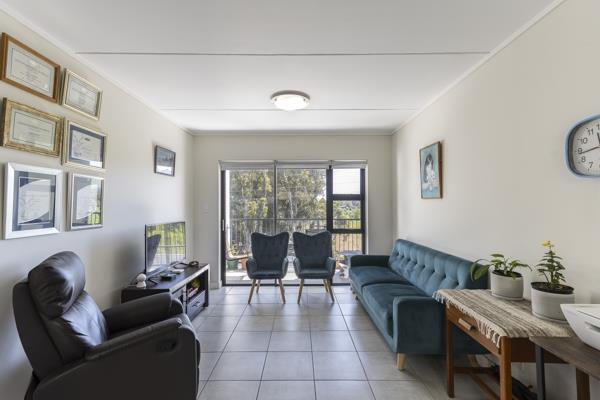 The open-plan kitchen boasts ample cupboard space, an oven, hob, and extractor fan, seamlessly flowing into a dining area and lounge that opens onto a balcony sheltered from the south-easter and mdashideal for year-round relaxation.