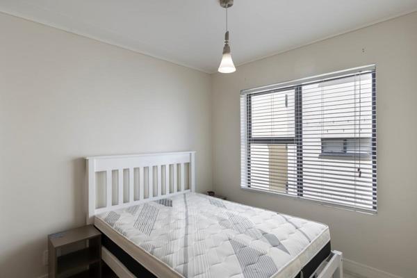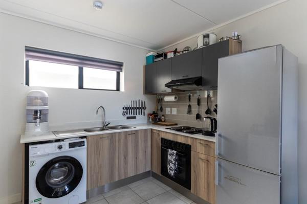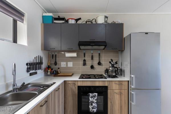 The contemporary kitchen features ample cupboard space, an oven, hob, and extractor fan, while the apartment is fully tiled throughout and fitted with stylish blinds. The unit includes two dedicated parking bays within a secure estate offering 24-hour security for complete peace of mind.