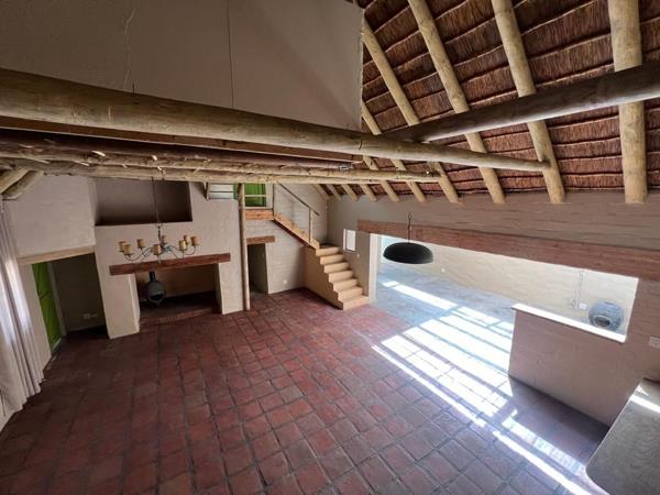 At its centre is an impressive double-volume lounge with exposed wooden beams and a traditional fireplace, creating a warm yet refined atmosphere. A mezzanine level overlooks the space and is perfectly suited as a home office, library, or private lounge.