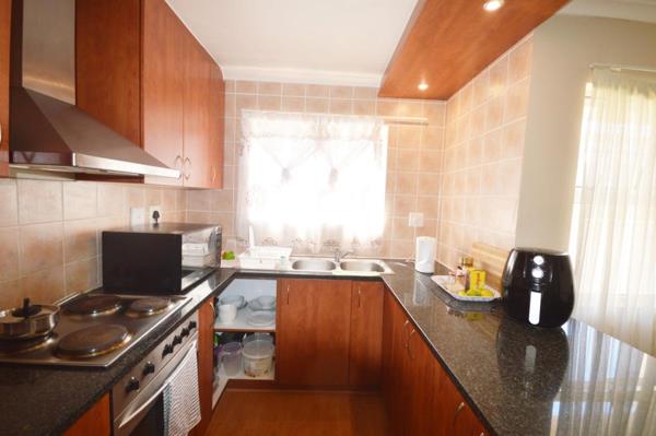 The home also boasts a double garage with extra storage space. In front of the house, theres a built-in braai area and a lovely space for kids or pets to play. The complex also includes visitors'' parking and a children''s play park just a short walk away.