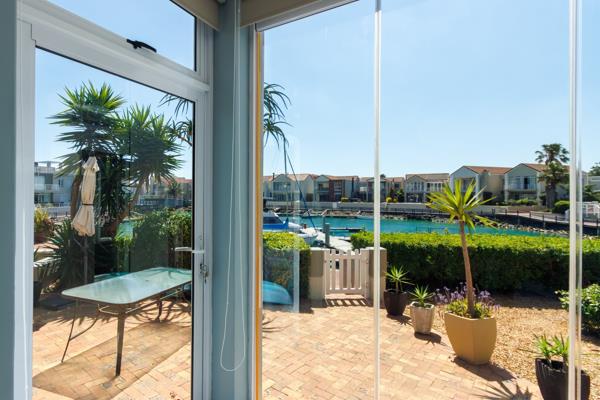 The enclosed patioideal as a dining areaboasts stacking doors that open to a charming outdoor space with uninterrupted views of the marina and breathtaking sunsets.