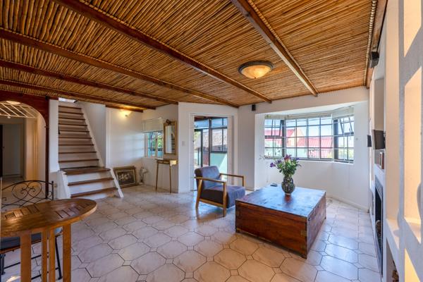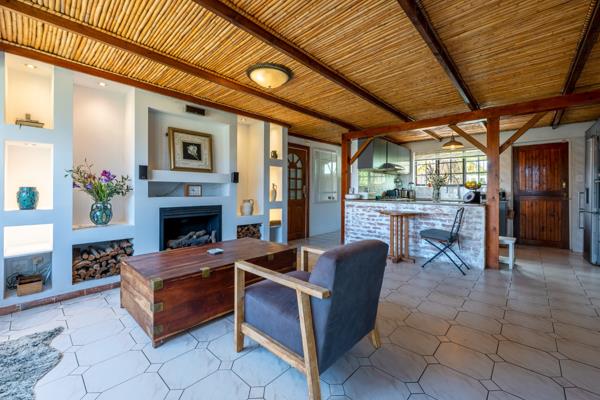 The home showcases a distinctive, character-filled design that blends natural textures with relaxed contemporary living. Exposed timber beams and a beautifully detailed reed-style ceiling create warmth and visual interest, giving the living spaces a unique lodge-inspired feel.