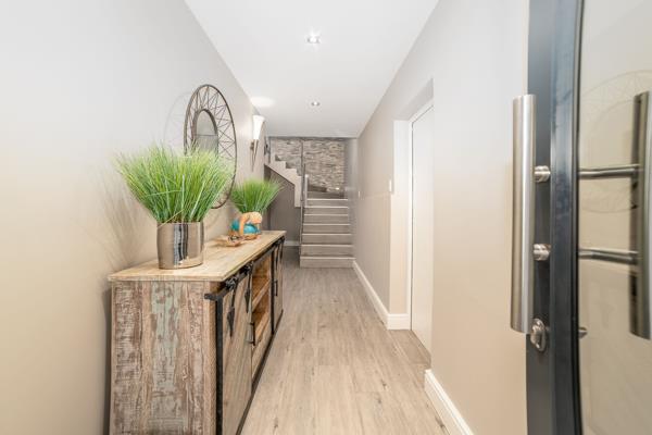 Moving upstairs, a large open plan kitchen and dining area awaits you. The kitchen has a separate scullery and laundry room. The kitchen flows into a large indoor entertainment area with ample space, combined with a huge indoor braai.
