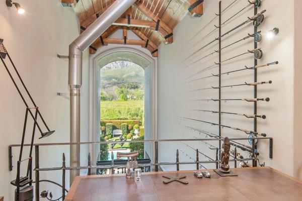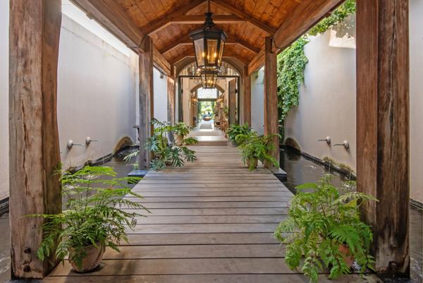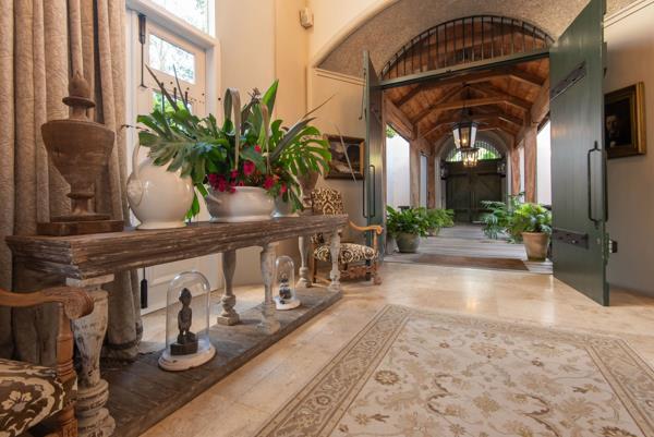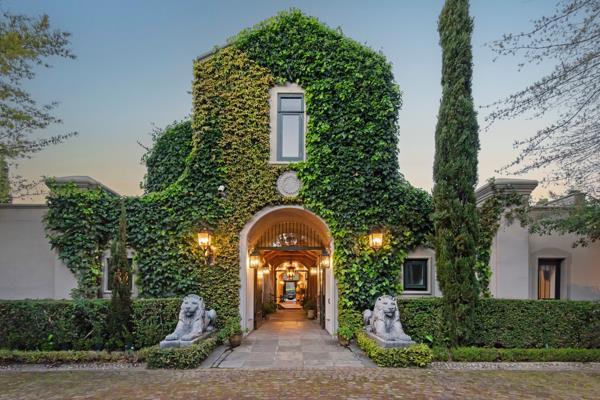 The art of timeless living, Franschhoek. Set in the quietest corner of the Franschhoek valley, just two kilometres from the village centre, Sandstone House commands attention from the moment you arrive. The paved courtyard, anchored by a sculptural fountain and flanked by stone lions, leads to an ivy-covered faade. The central gabled entrance rises like a pavilion, all classical curves and considered details. This is a residence that understands the power of first impressions.