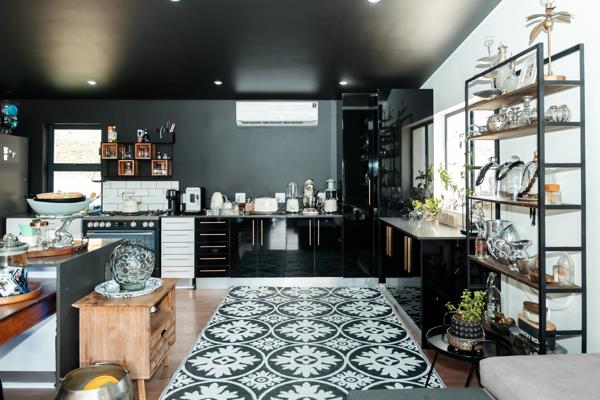 The modern kitchen, finished in striking black and white high-end joinery, features a 5-burner gas stove and a separate scullery, while the adjacent courtyard terrace offers the ideal space for a splash pool or KolKol wood-fired tub, all framed by breathtaking mountain scenery and vineyards as a backdrop.
