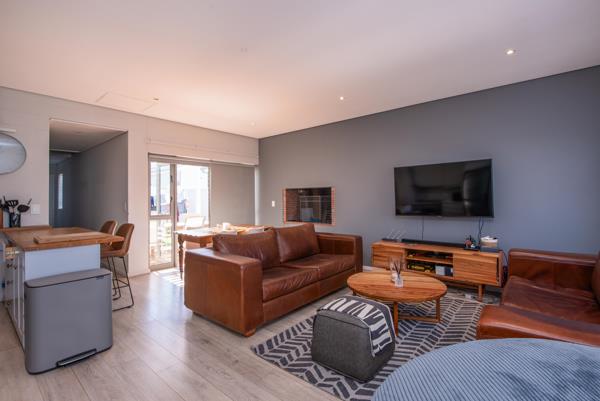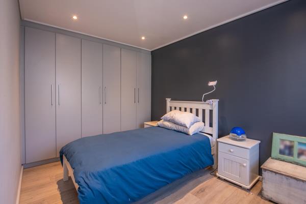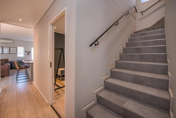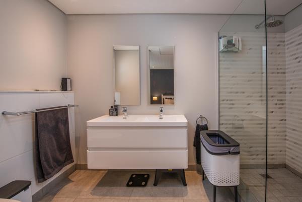The sleek kitchen features a 5-burner gas hob and practical finishes, with a modern yet homely aesthetic. Added extras include a solar geyser and American shutters in the bathrooms.