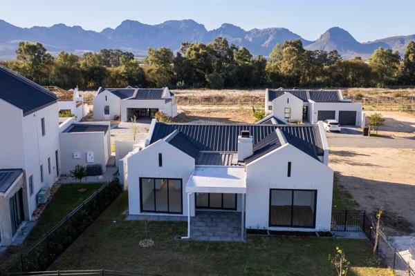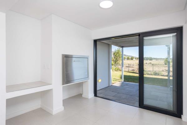Entertaining is a delight with a built-in stainless-steel braai, ideal for gatherings and enjoying the weather and striking sunsets. A double garage provides secure parking and storage. Outside, a low-maintenance, irrigated garden overlooks a beautifully landscaped park and surrounding vineyards.