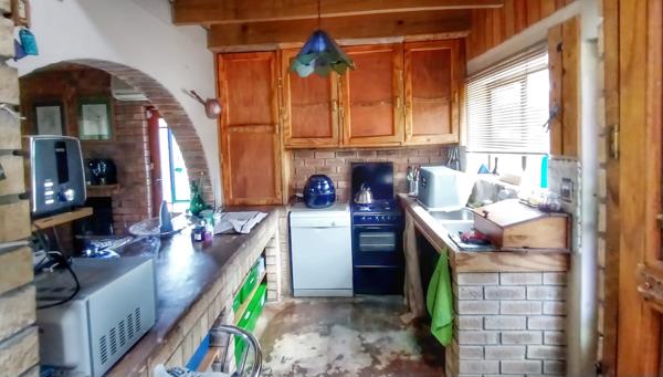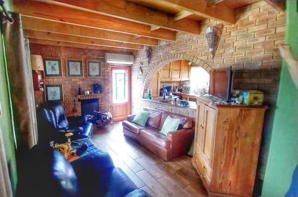 Step inside to discover a warm, rustic interior featuring exposed brick walls and wooden ceiling beams, creating an inviting atmosphere. The open-plan living area seamlessly connects to one of two functional kitchens, both equipped for everyday needs. Two comfortable lounges provide ample space for relaxation and entertainment, complemented by durable tiled flooring and a cozy fireplace. An air conditioning unit ensures comfort throughout the seasons.