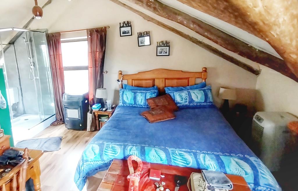 The residence boasts four well-appointed bedrooms, including a unique attic bedroom with exposed wooden beams and a convenient en-suite shower cabin. The main bathroom offers a luxurious escape with a jacuzzi tub and a separate walk-in shower featuring a distinctive pebble floor, alongside rustic design elements. A dedicated home office space, also adorned with exposed beams and abundant natural light, provides an ideal environment for productivity.
