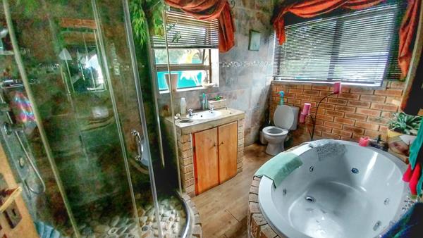 Beyond the interiors, the property truly shines with its expansive outdoor offerings. A spacious covered patio, complete with wooden decking and architectural arches, provides an ideal setting for outdoor entertaining and enjoying lush garden views. The vast 4.55-hectare erf presents breathtaking panoramic mountain and valley views, offering tranquility and potential for further landscaping. Three dedicated parking spaces add convenience to this exceptional property.