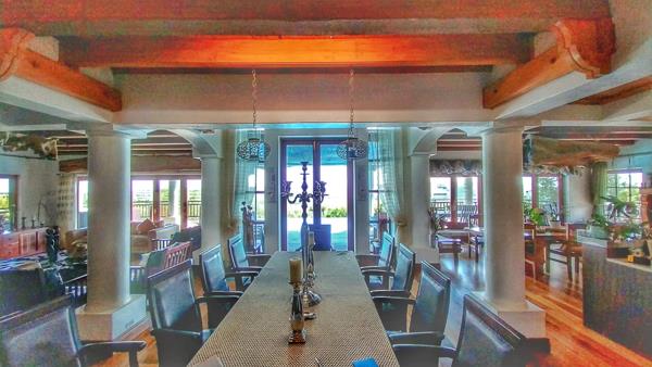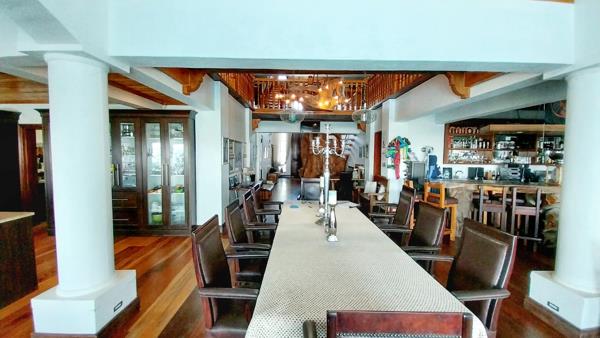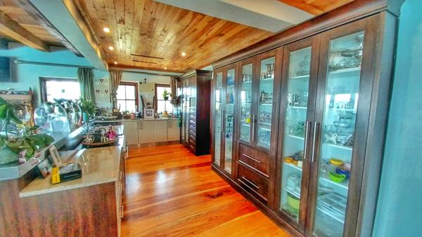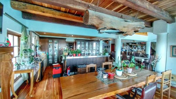 The interior features a grand, open-plan design with rich hardwood flooring and exposed wooden beams, creating a warm and inviting atmosphere. The property includes three well-appointed kitchens, a dedicated dining room, and a comfortable lounge area, all designed for seamless flow and entertaining. The rustic-elegant aesthetic is enhanced by extensive dark wood cabinetry, offering ample storage and display space, while multiple windows ensure abundant natural light throughout the living areas.