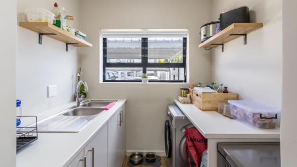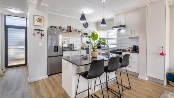 The open-plan layout features a bright and spacious living area that flows into a sleek kitchen with quality finishes, ample cupboard space, and room for all appliances. Large windows invite natural light, creating a warm and welcoming atmosphere throughout.